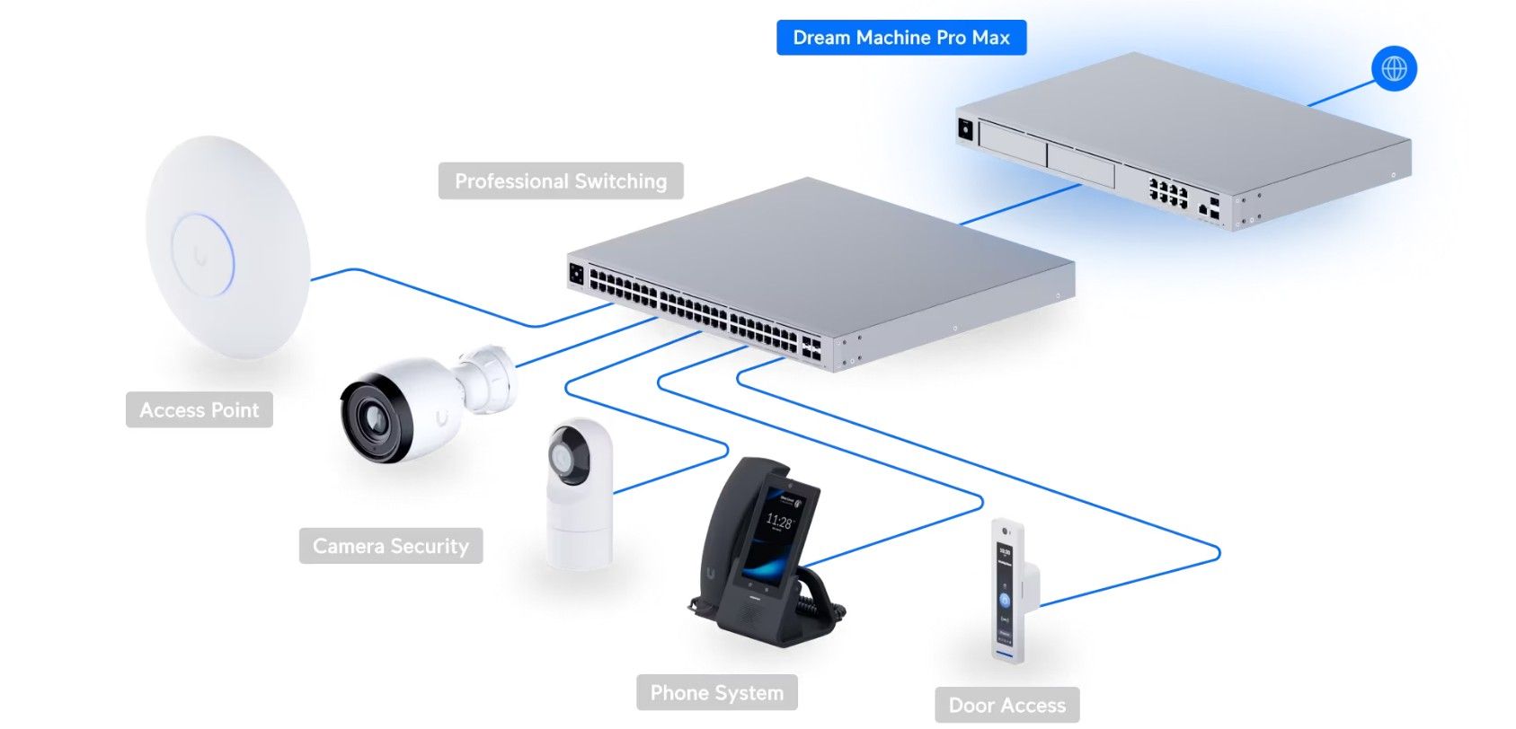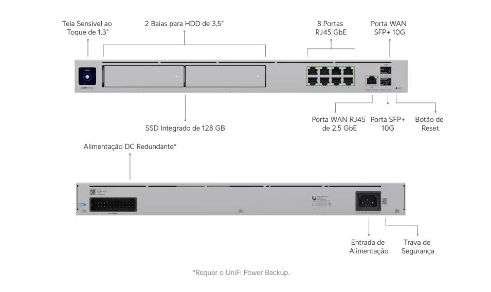Cloud Gateway de 10G com suporte a mais de 200 dispositivos UniFi e mais de 2.000 clientes, roteamento IPS de 5 Gbps e armazenamento NVR redundante.