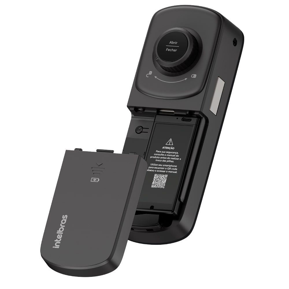 A MFR 2040 utiliza bateria de lítio recarregável (modelo 18650), fácil de encontrar e econômica. Dispensa pilhas e oferece até 10 meses de autonomia com uso diário. O recarregamento* é feito direto na fechadura via USB-C, com sugestão de recarga a cada 6 meses para maior durabilidade (até 5 anos).