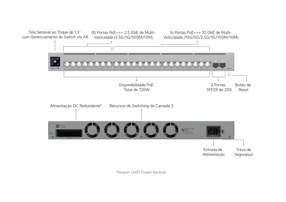 AdicionarSwitch UniFi profissional com 24 portas multi-gigabit PoE+++, 2 portas SFP28 de 25G, até 720W de PoE e recursos avançados de Camada 3 para redes corporativas de alto desempenho.